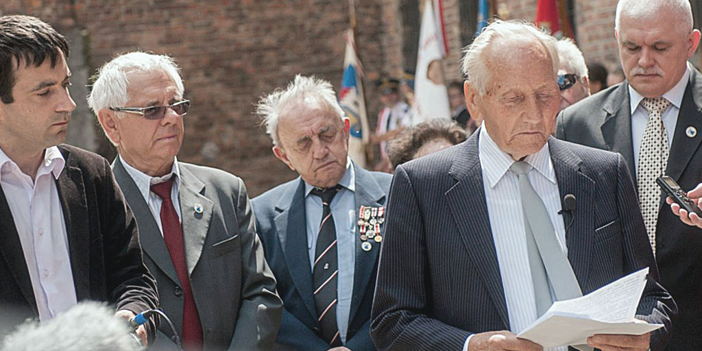 Speech by Kazimierz Piechowski at the Auschwitz Concentration Camp’s “Death Wall” during the celebration of the National Day of Remembrance of the victims of German Concentration Camps (this name of the Memorial Day was reclaimed by the Christian Association of Auschwitz Families as it originally sounded, before the guards of political correctness from the Sejm turned the word “German” into the term “Nazi”).